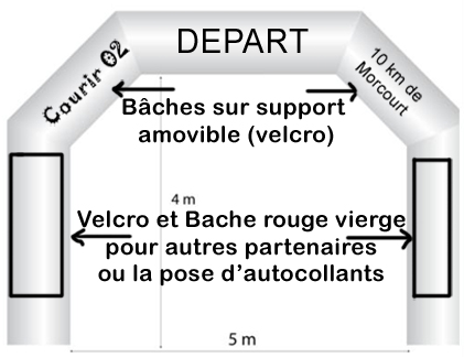 L'arche est équipée d'une soufflerie qui tourne en permanence (prévoir une arrivée électrique). Comptez une dizaine de minutes pour son installation. Elle est réversible avec d'un côté marqué « ARRIVEE » et de l'autre « DEPART ». Des emplacements publicitaires sont disponibles pour vos sponsors. Ces emplacements se situent sur les piliers verticaux et mesurent 1,80 m en hauteur et 0,80 m de large.