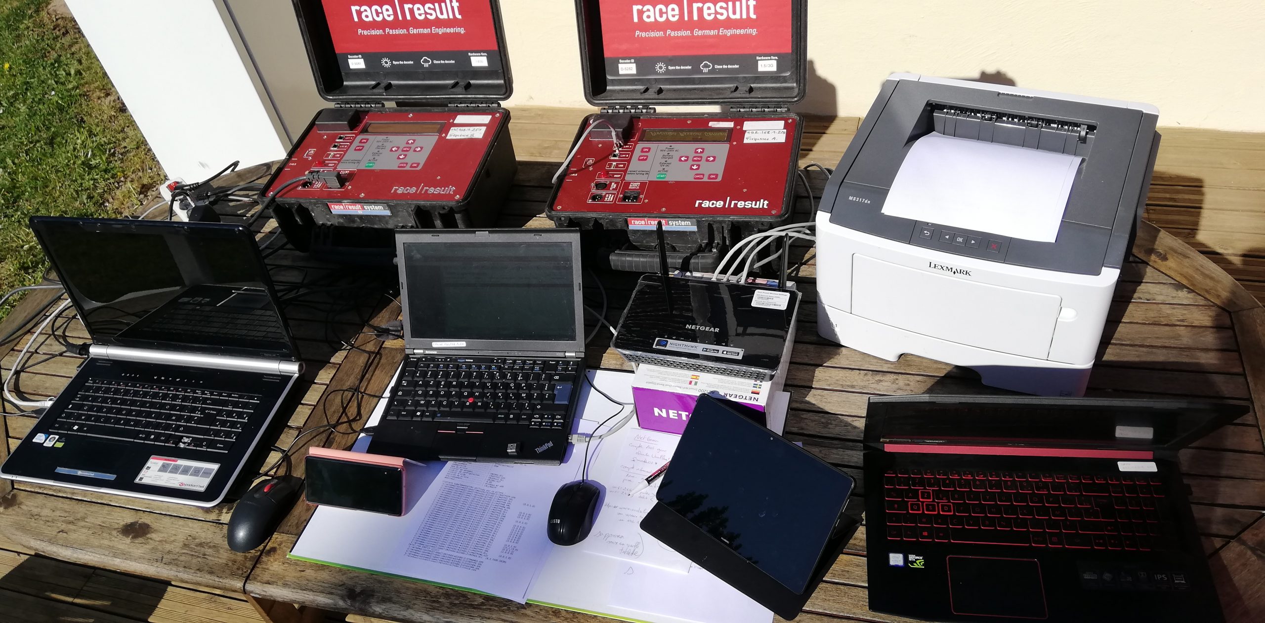 Le logiciel de chronométrage est accessible depuis n'importe quel ordinateur. De plus, le réseau est pourvu d'une connexion WIFI qui va permettre une saisie déportée des éventuelles inscriptions et modification sur place (être dans la zone des 100 m). Mais, par sécurité les liaisons ordinateurs -/- transpondeurs resteront filaires.